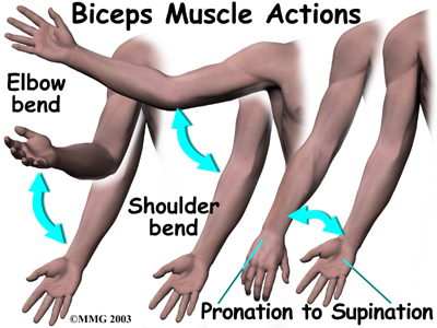 can bend the elbow upward. The biceps can also help flex the shoulder, raising the arm up. And the biceps can rotate, or twist, the forearm in a way that points the palm of the hand up. This movement is called . Supination positions the hand as if you were carrying a tray.