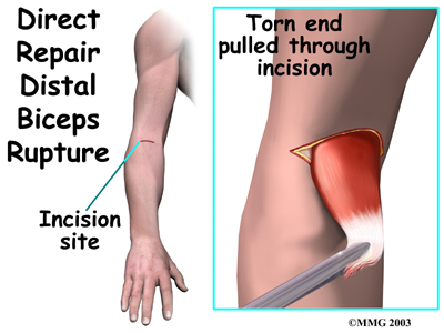 In a direct repair, the surgeon begins by making a small incision across the arm, just above the elbow. Forceps are inserted up into this incision to grasp the free end of the ruptured biceps tendon. The surgeon pulls on the forceps to slide the tendon through the incision.