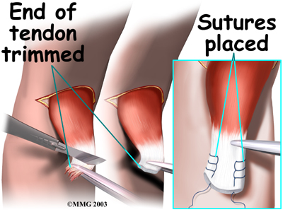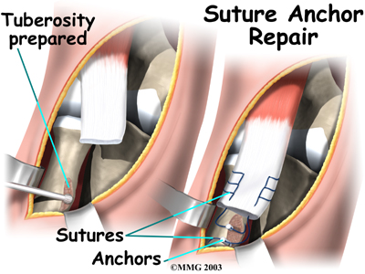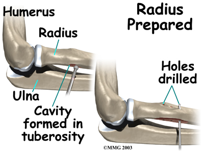 The original attachment on the radius, the radial tuberosity, is by shaving off the surface with a burr. The burr is then used to create a small cavity in the bone for the tendon to fit inside. Two small suture anchors are embedded into the cavity in the radial tuberosity. These anchors can either be screwed into the bone or implanted like a staple. Each anchor has a long thread (suture) connected to it. The into the lower end of the tendon and crisscrossed upward. The surgeon slides the sutures back and forth, which coaxes the end of the tendon into the cavity. When the end of the tendon is positioned in the cavity, the surgeon tightens the sutures, fixing the tendon in place.