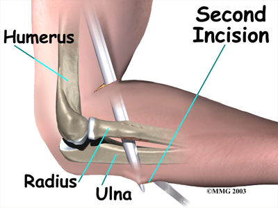 A curved instrument is passed through the incision and directly between the radius and ulna bones. The surgeon pushes the instrument through this space, puncturing the muscles and soft tissues. The surgeon feels the back side of the forearm for the spot where the instrument is protruding. A is made at this spot.
