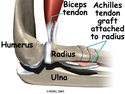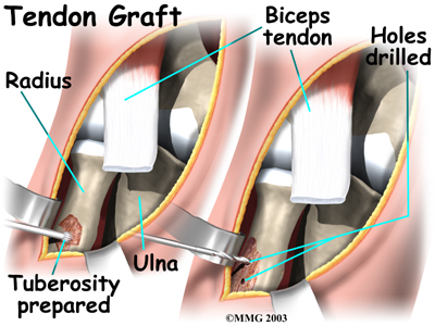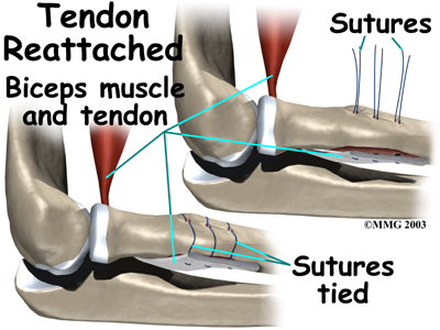The tendon is passed between the radius and ulna, exiting through the second incision that was made on the back of the forearm. The sutures are threaded into the three holes that were drilled into the rim of the radial tuberosity. The surgeon ties the sutures, securing the . When the surgeon is satisfied with the repair, the skin incisions are closed, and the elbow is placed either in a cast or a range-of-motion brace.
