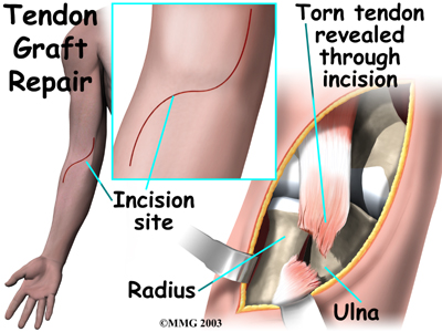 If more than three or four weeks have passed since the rupture, the surgeon will usually need to make a larger incision in the front of the elbow. Also, because the tendon will have retracted further up the arm, graft tissue will be needed in order to reconnect the biceps to its original point of attachment on the radial tuberosity.