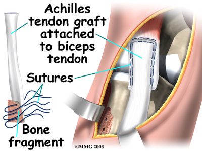 When the is used, the surgeon leaves a small piece of the heel bone attached to the piece of tendon. Small holes are drilled into the piece of bone. Sutures are woven through these holes and will later be used to secure the end of the graft to the radial tuberosity. In this way, the graft will have a bone-to-bone connection that heals together. The healed bone solidly fixes the the graft to the radial tuberosity. After the graft is in place, its top end is then stitched over the front of the biceps muscle.