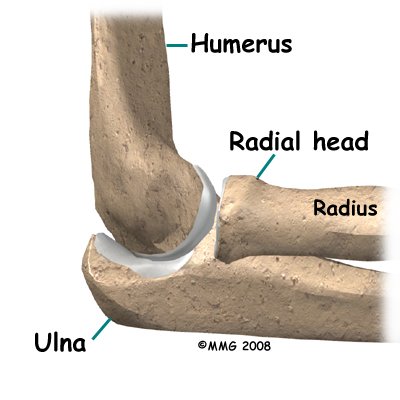The elbow itself is essentially a hinge joint, meaning it bends and straightens like a hinge. Most people don’t realize that there is a second joint where the end of the radius (the radial head) meets the humerus. This joint is complicated because the radius has to rotate so that you can turn your hand palm up and palm down. At the same time, it has to slide against the end of the humerus as the elbow bends and straightens. The joint is even more complex because the radius has to slide against the ulna as it rotates as well. As a result, the end of the radius at the elbow is shaped like a smooth knob with a cup at the end to fit on the end of the humerus. The edges are also smooth where it glides against the ulna.