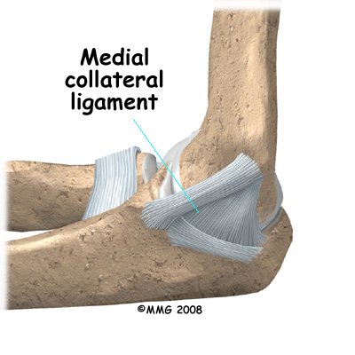 In the elbow, two of the most important ligaments are the medial collateral ligament (MCL) and the lateral collateral ligament (LCL). The MCL of the elbow is on the inside edge, and the LCL is on the outside edge. Together these two ligaments connect the humerus to the ulna and keep it tightly in place as it slides through the groove at the end of the humerus and bends the elbow. These ligaments are the main source of stability for the elbow. They can be torn when there is an injury to or dislocation of the elbow. If they do not heal correctly the elbow can be too loose, or unstable.