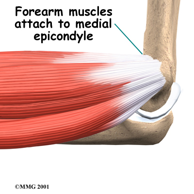 Medial epicondylitis is commonly known as golfer's elbow. This does not mean that only golfers have this condition. But the golf swing is a common cause of medial epicondylitis. Many other repetitive activities can also lead to golfer's elbow: throwing, chopping wood with an ax, running a chain saw, and using many types of hand tools. Any activities that stress the same forearm muscles can cause symptoms of golfer's elbow.