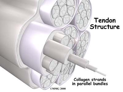 Because the collagen strands in tendons are lined up, tendons have high tensile strength. This means they can withstand high forces that pull against both ends of the tendon. When muscles work, they pull on one end of the tendon. The other end of the tendon pulls on the bone, causing the bone to move.