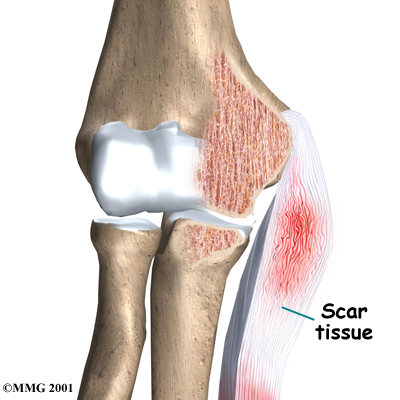 Instead of inflammatory cells, the body produces a type of cells called fibroblasts. When this happens, the collagen loses its strength. It becomes fragile and can break or be easily injured. Each time the collagen breaks down, the body responds by forming scar tissue in the tendon. Eventually, the tendon becomes thickened from extra scar tissue.