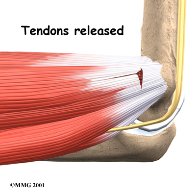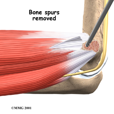 The flexor tendon is then cut where it connects to the medial epicondyle. The surgeon splits the tendon and takes out any extra scar tissue. Any bone spurs found on the medial epicondyle are removed. (Bone spurs are pointed bumps that can grow on the surface of the bones.) Some surgeons suture the loose end of the tendon to the nearby fascia tissue. (Fascia tissue covers the muscles and organs throughout your body.)