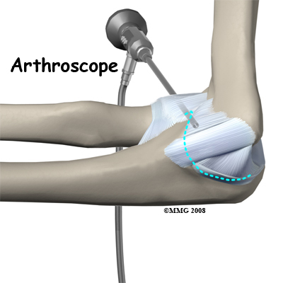 When the condition fails to respond to conservative care described above, surgery may be indicated. If pain is the primary symptom and there is no evidence that the elbow joint is grossly unstable, the surgeon may use an (a tiny fiber-optic TV camera) to look inside the elbow and see the condition of the joint and the soft tissues. It may be possible to debride any tissue fragments or frayed edges. During debridement, the surgeon carefully cleans the area by removing any dead or damaged tissue. Any bone spurs or areas of calcium build-up are also removed.