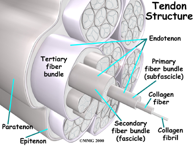 As we age, our tendons can degenerate. Degeneration means that wear and tear occurs in the tendon over time and leads to a situation where the tendon is weaker than normal. Degeneration in a tendon usually shows up as a loss of the normal arrangement of the fibers of the tendon. Tendons are made up of strands of a material called . (Think of a tendon as similar to a nylon rope and the strands of collagen as the nylon strands.)