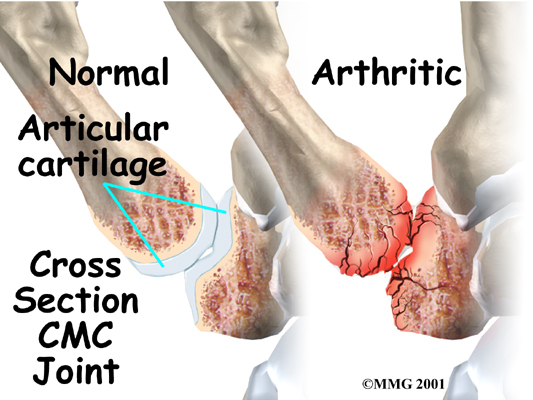 Injury to a joint, such as a bad sprain or fracture, can cause damage to the articular cartilage. An injury to the CMC joint of the thumb, even if it does not injure the articular cartilage directly, can alter how the joint works. After a fracture of the thumb metacarpal, the bone fragments may heal in slightly different positions. The joints may then line up differently. This is also true when the ligaments around the CMC joint are damaged by a sprain. When an injury results in a change in the way the joint moves, the injury may increase the forces on the articular cartilage surfaces. This is similar to any mechanical device or machinery. If the mechanism is out of balance, it tends to wear out faster.