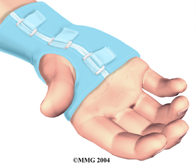 Our physical therapist will often have you wear a . This sometimes decreases the symptoms in the early stages of CTS. A brace keeps the wrist in a resting position, not bent back or bent down too far. When the wrist is in this position, the carpal tunnel is as big as it can be, so the nerve has as much room as possible inside the carpal tunnel. A brace can be especially helpful for easing the numbness and pain felt at night because it can keep your hand from curling under as you sleep. The wrist brace can also be worn during the day to calm symptoms and rest the tissues in the carpal tunnel.