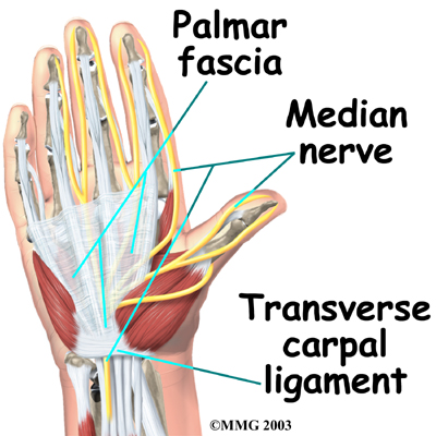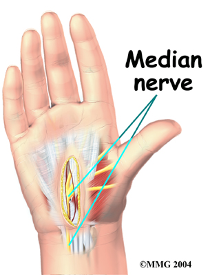Care is taken to make sure that the median nerve and flexor tendons are out of the way and protected. By cutting the carpal ligament, pressure is taken off the median nerve.
