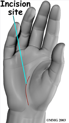 A small incision is made in the palm of the hand, usually about one inche long. In some severe cases, a slightly longer incision is extended into the forearm.