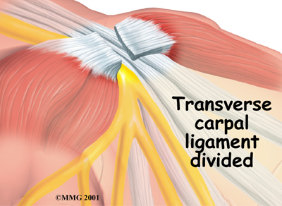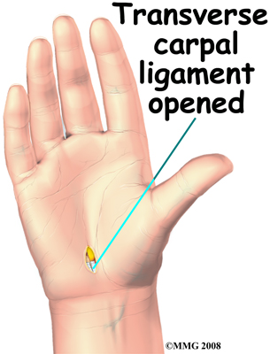 Upon dividing the carpal ligament, the surgeon stitches just the skin together and leaves the loose ends of the carpal ligament separated. The loose ends are left apart to keep pressure off the median nerve. Eventually, the gap between the two ends of the ligament fills in with scar tissue.