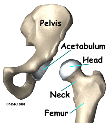 is one of the true ball-and-socket joints of the body. The hip socket is called the acetabulum and forms a deep cup that surrounds the ball of the upper thigh bone, known as the femoral head. The thick muscles of the buttock at the back and the thick muscles of the thigh in the front surround the hip.