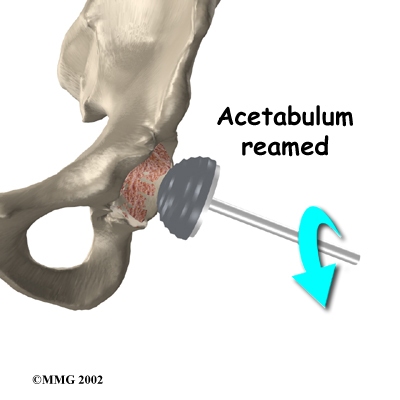 Attention is then turned toward the socket. The surgeon uses a power drill and a special reamer (a cutting tool used to enlarge or shape a hole) to remove cartilage from inside the acetabulum.