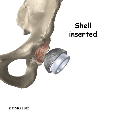 In the uncemented variety of artificial hip replacement, the metal shell is held in place by the tightness of the fit or by using screws to hold the shell in place. In the cemented variety, a special epoxy-type cement is used to anchor the acetabular component to the bone.