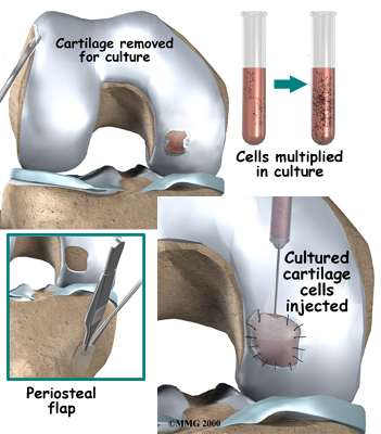 This is a new way to help restore the structural makeup of the articular cartilage. Surgeons may recommend this procedure for active, younger patients (20 to 50 years old) when the bone under the lesion hasn't been badly damaged, and when the size of the lesion is small (less than four centimeters in diameter). A short surgery is scheduled to allow the surgeon to take a few chondrocytes from inside the knee cartilage. These cells are grown in a laboratory. At a later date, the patient returns for a second surgery, during which the surgeon implants the newly grown cartilage into the lesion and covers it with a small flap of tissue. The cover holds the cells in place while they attach themselves to the surrounding cartilage and begin to heal.