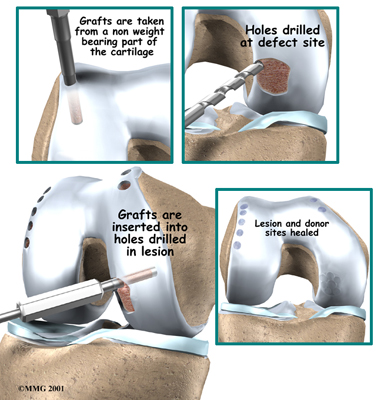 In these procedures, tissue is placed inside the lesion in hopes of restoring the normal structure and function of the original cartilage. The stimulation methods and these newer procedures are showing improved results in helping people return to normal activity.
