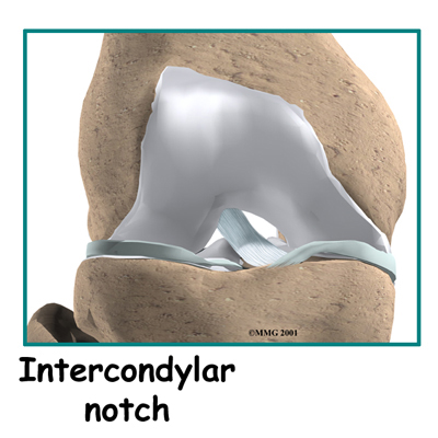 The ACL runs through a special notch in the femur called the and attaches to a special area of the tibia called the tibial spine.
