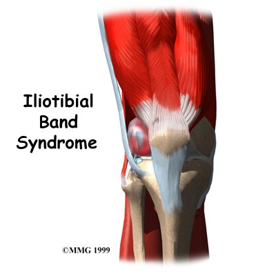 Recently, health experts have found that runners with a weakened or fatigued gluteus medius muscle in the hip are more likely to end up with ITB syndrome. This muscle controls outward movements of the hip. If the gluteus medius isn't doing its job, the thigh tends to turn inward. This makes the knee angle into a knock-kneed position. The ITB becomes tightened against the bursa on the side of the knee. This is also called a valgus deformity of the knee. People with bowed legs may also be at risk of developing ITB syndrome. The outward angle of the bowed knee makes the lateral femoral condyle more prominent and can make the snapping worse. This condition is also called a varus deformity of the knee. SymptomsWhat does ITB syndrome feel like? The symptons of ITB syndrome commonly begin with pain over the outside of the knee, just above the knee joint. Tenderness in this area is usually worse after activity. As the bursitis grows worse, pain may radiate up the side of the thigh and down the side of the leg. Patients sometimes report a snapping or popping sensation on the outside of the knee.