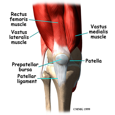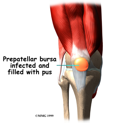 The prepatellar bursa can also become infected. This may occur without any warning, or it may be caused by a small injury and infection of the skin over the bursa that spreads down into the bursa. In this case, instead of blood or inflammatory fluid in the bursa, pus fills it. The area around the bursa becomes hot, red, and very tender.