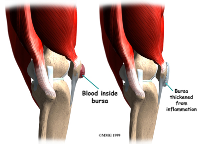 The blood in the bursa is thought to cause an inflammatory reaction. The walls of the bursa may thicken and remain thickened and tender even after the blood has been absorbed by the body. This thickening and swelling of the bursa is referred to as prepatellar bursitis.