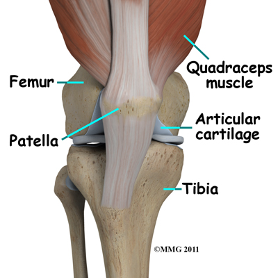 The knee joint is formed where the femur (lower end of the thighbone) connects with the tibia (upper end of the main lower leg bone). On the front of the joint is the patella (kneecap). The patella is what is called a sesamoid bone that is a part of the extensor mechanism of the knee joint. The extensor mechanism connects the large muscles of the thigh to the tibia such that contracting the thigh muscles pulls on the tibia and allows us to straighten the knee. The parts of the extensor mechanism include the thigh muscles, the quadriceps tendon, the patella and the patellar tendon.