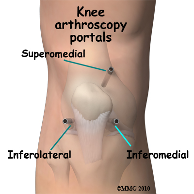 The surgeon begins the operation by making two or three small openings into the knee, called portals. These portals are where the arthroscope and surgical instruments are placed inside the knee. Care is taken to protect the nearby nerves and blood vessels. A small metal or plastic tube (or cannula) will be placed through one of the portals to inflate the knee with sterile saline, which allows the tissues inside the joint to be more easily visible.