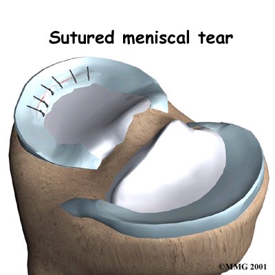 Using the arthroscope and a probe, the surgeon locates the tear. The probe is used to push the torn edges of the meniscus together. A small rasp or shaver is used to roughen the edges of the tear. Then a hollow tube called a cannula is inserted through one of the portals. The surgeon threads a suture through the cannula and into the knee joint. The suture is sewn into the two edges of the tear. The surgeon tugs on the thread to bring the torn edges close together. The suture is secured by tying two to three knots. Additional sutures are placed side by side until the entire tear is: