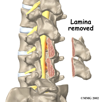 The lamina forms a roof-like structure over the back of the spinal column. When the nerves in the spinal canal are squeezed by a degenerated disc or by bone spurs pushing into the canal, a removes most, or all of the lamina to release pressure on the spinal nerves.