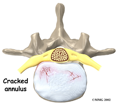 Herniation occurs when the nucleus in the center of the disc pushes out of its normal space. The nucleus presses against the annulus, causing the disc to bulge outward. Sometimes the nucleus herniates completely through the annulus and squeezes out of the disc.