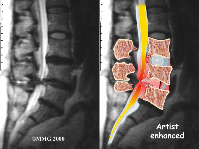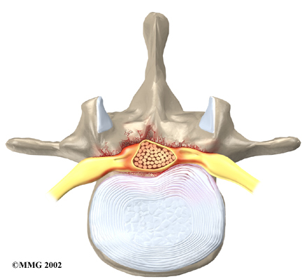 Disc herniation: Spinal stenosis can occur when an intervertebral disc in the low back (ruptures). Normally, the shock-absorbing disc is able to handle the downward pressure of gravity and the strain from daily activities. However, if the pressure on the disc is too strong, such as landing from a fall in a sitting position, the nucleus inside the disc may rupture through the outer annulus and squeeze out of the disc. This is called a disc herniation. If an intervertebral disc herniates straight backward, it can press against the nerves in the spinal canal, causing symptoms of spinal stenosis.
