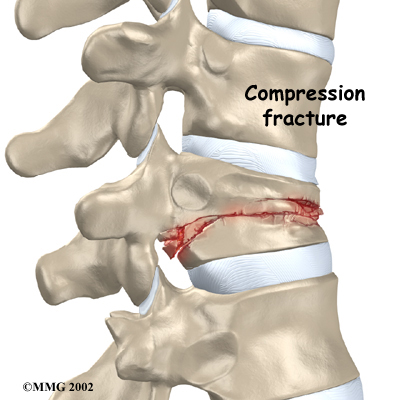 Strong, healthy bones are able to withstand the forces and strains of normal activity. Compression fractures in the spine happen when either the forces are too great or the bones of the spine aren't strong enough. The vertebral body cracks under pressure. Fractures from forceful impact on the spine tend to crack the back (posterior) part of the vertebral body. Fractures from osteoporosis usually occur in the front (anterior) part of the vertebral body.