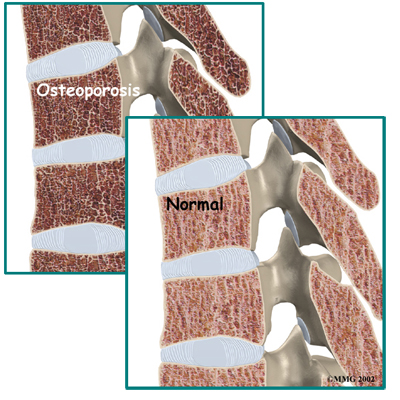 is a disease that weakens bone. Sometimes the bones in the spine weaken to the point that even mild forces can lead to a compression fracture. A simple action like reaching down to pull on a pair of socks can cause a weakened vertebra to fracture. The front of the vertebra (the part closest to the front of the body) crumbles, causing the round vertebral body to become wedge-shaped. This angles the spine forward, producing a hunch-backed appearance, called kyphosis.
