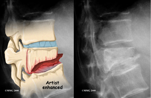 Severe from forceful impact on the spine, as can happen in a car accident, can cause fragments of the vertebral body to push into the spinal canal and press against the spinal cord. This can cause damage to the spinal cord that can result in partial or complete paralysis below the waist. It is rare for a typical compression fracture from osteoporosis to cause damage to the spinal cord.