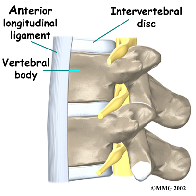ALIF surgery is performed through the front (anterior). The structures in this area include the anterior longitudinal ligament, the vertebral bodies, and the intervertebral discs. The anterior longitudinal ligament attaches along the front of the spinal column. The vertebral bodies are the large blocks of bone that make up the front section of each vertebra. The intervertebral discs are the cushions between each pair of vertebrae.