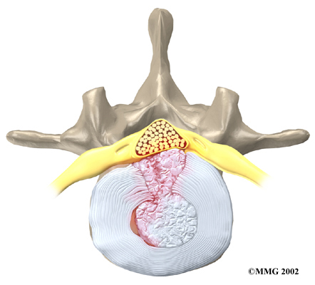 If the nucleus presses against the spinal nerves, symptoms of pain, numbness, and weakness may occur where the nerve travels. Pressure on the spinal nerves inside the spinal canal can also produce problems with the bowels and bladder, requiring emergency surgery.