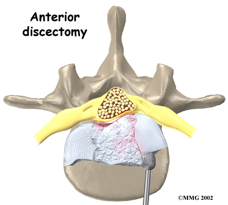 The surgeon inserts a needle into the disc. By taking an X-ray with the needle in place, the correct disc is identified. Forceps are used to open the front of the disc. Next, a tool is attached to the vertebrae to spread them apart. This makes it easier for the surgeon to see between the two vertebrae. A small cutting tool (a burr) is used to carefully remove the front half of the disc. A special surgical microscope may be used to help the surgeon see while removing pieces of disc material near the back of the disc space.