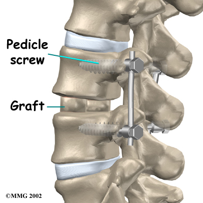Most surgeons apply some form of metal hardware, called instrumentation, to prevent movement between the vertebrae. Instrumentation protects the graft so it can heal better and faster. One option involves screwing a strap of metal across the front surface of the spine over the area where the graft rests. A second method involves additional surgery through the low back, either on the same day or during a later surgery. In this operation, metal plates and screws are applied through the back of the spine, locking the two vertebrae and preventing them from moving.