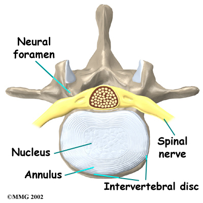 Surgeons perform lumbar discectomy surgery through an incision in the low back. This area is known as the posterior region of the low back. The involved is the intervertebral disc, which acts as a cushion between each pair of vertebrae. The two main parts of the disc are the annulus and the nucleus. The lamina bone forms the protective covering over the back of the spinal cord. During surgery, this section of bone is removed over the problem disc. The surgeon also checks the spinal nerves where they travel from the spinal canal through the neural foramina. The neural foramina are small openings on each side of the vertebra. Nerves that leave the spine go through the foramina, one on the left and one on the right.