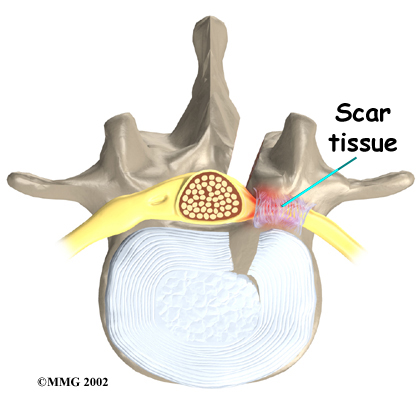 Any surgery that is done near the spinal canal can potentially cause injury to the spinal cord or spinal nerves. Injury can occur from bumping or cutting the nerve tissue with a surgical instrument, from swelling around the nerve, or from the formation of . An injury to the spinal cord or spinal nerves can cause muscle weakness and a loss of sensation to the areas supplied by the nerve.