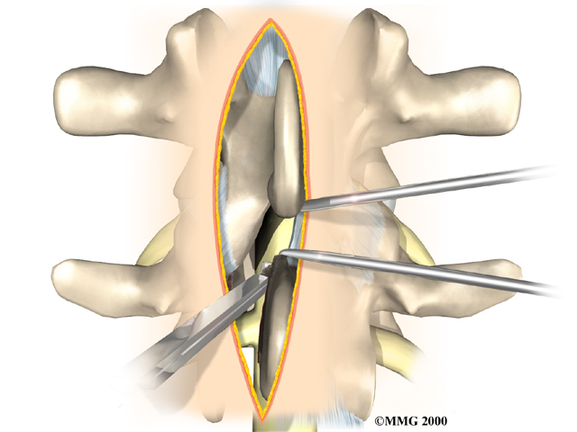 This surgery is done through an incision in the low back. The incision reaches to the spinous processes, the bony projections off the back of the vertebrae. A large block of bone, called the vertebral body makes up the front section of each vertebra. The vertebral bodies are separated by a soft cushion called an intervertebral disc.