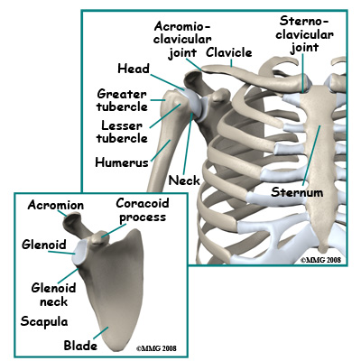 The bones of the shoulder region are the sternum (breastbone), the clavicle (collarbone), the scapula (shoulder blade), and the humerus (arm bone). The joint between the sternum and the clavicle is called the sternoclavicular joint. Movement at this joint allows you to shrug your shoulder, pull the shoulder back, or bring it forward.