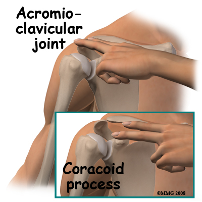 The acromioclavicular joint (AC joint) is not easy to feel. The acromion process is a bony prominence of the shoulder blade situated at the upper and outer part of the shoulder, just under the skin. If you place three fingers (of the opposite hand) on top of the shoulder the AC joint will be beneath them. If you now swing the arm forward and back you will appreciate movement (rotation) between the acromion and the collarbone.