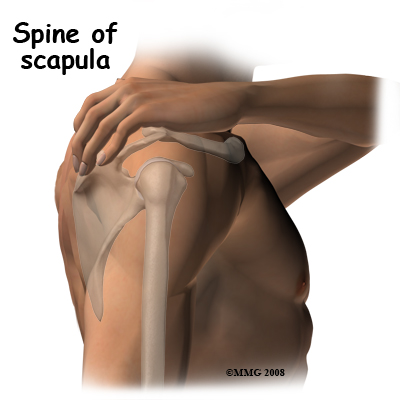 The spine of the scapula can be felt by placing the heel of your opposite hand on the collarbone and letting your fingers reach and rest towards your back. Your fingertips will bit sitting on a hard ridge of bone at the back of the shoulder blade with softer tissue (muscle) above and below. This is the spine of the scapula, which is the boundary between two important muscles that rotate and stabilize the shoulder. Above the spine of the scapula is the supraspinatus muscle and below the spine is the infraspinatus muscle. They can be felt contracting when you rotate the arm out.