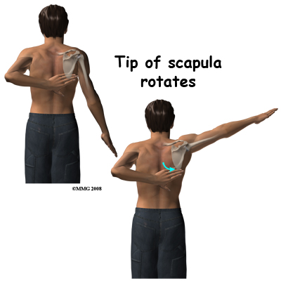 The tip of the scapula can be felt if you put your other hand behind your back and reach up towards the shoulder. Normally you can just touch the lower tip of the opposite shoulder blade. If you now swing your arm out to the side (abduct the arm) you will feel the tip of the blade rotate outwards over the chest wall. This motion between the scapula and thoracic rib cage (scapulothoracic motion) is an important part of shoulder movement and must be recovered if you are to regain full range of motion after an injury. The upper end of the humerus is covered with thick muscle so it is difficult to feel. If you feel the acromion process and move your finger forwards to the front end of the bone then rotate your arm, you will feel the rotation of the head of the humerus through the muscle. The glenohumeral joint is too deep to feel.
