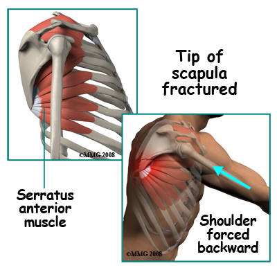 Fracture of the tip of the scapula is usually an avulsion fracture. Powerful muscles attach to the lower tip of the scapula. These muscles act to either rotate or stabilize the scapula against the chest. Since most of the muscles that move the arm attach to the scapula, one important function of the muscles that go between the rib cage and the scapula is to hold the blade still. They tend to "lock" and clamp the scapula to the chest wall. In this situation, if a force on the arm is enough to move the scapula back away from the chest wall, the muscle attachment to the tip is pulled off. Bracing your arm before an impact may result in this injury. Usually it can be treated non-operatively.